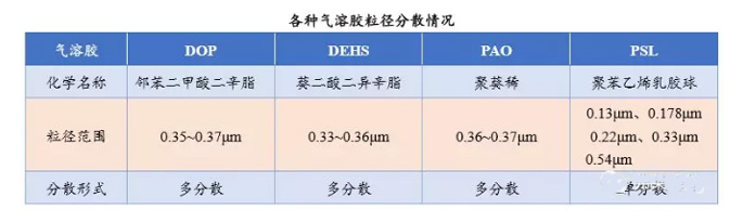 在安裝高效過濾器后的現(xiàn)場(chǎng)檢查中,實(shí)際上不可能使用MPPS方法。 只有粒徑接近 MPPS 粒徑的氣溶膠才能用于檢測(cè)泄漏。 而對(duì)于多分散氣溶膠,要注意是使用幾何平均粒徑還是質(zhì)量平均粒徑。 目前常用的氣溶膠及其粒徑范圍見下表。