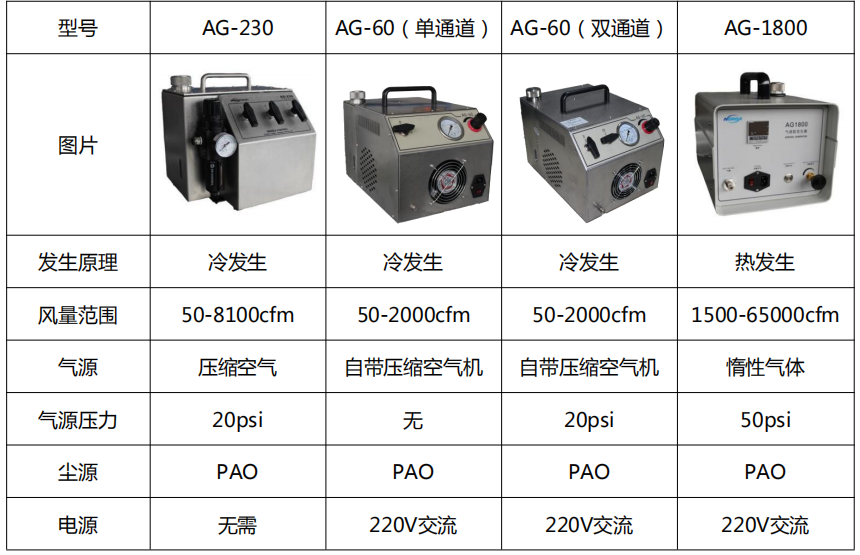 冷發(fā)生(如:AG-230,AG-60)是由壓縮空氣加壓PAO油,PAO油由Laskin噴嘴噴出,由噴嘴的工作數(shù)量來調(diào)試產(chǎn)塵濃度的大小,適合于頂部無送風管的局部FFU單元和生物安全柜潔凈工作臺的檢測,也可用于空調(diào)系統(tǒng),但因其適應風量的限制,往往在一條空調(diào)系統(tǒng)要分段檢測,分多個導入點,使用起來沒有AG-1800熱發(fā)生的方便,也有的空調(diào)系統(tǒng)因不方便分段檢測,而無法使用此類產(chǎn)塵量小的產(chǎn)塵儀。
